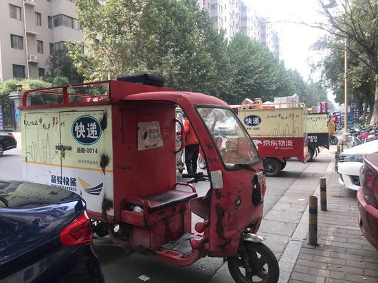 韓師傅:我們八毛五,比其他快遞稍微高一點。放快遞柜也收錢,有三毛有三毛五的,就剩五毛、五毛五了。我們不放沒辦法,我們送不完。