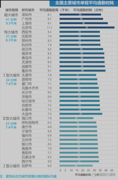 36分鐘,是全國主要城市通勤人口的單程平均時耗。其中,超大城市平均通勤時耗41分鐘,特大城市37分鐘,Ⅰ、Ⅱ型大城市分別為34、33分鐘。