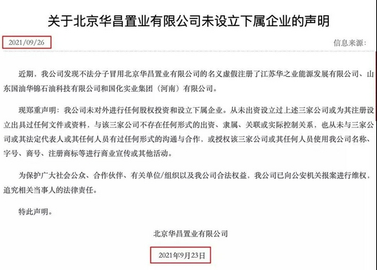 中石油官網(wǎng)在9月26日發(fā)布的《關(guān)于北京華昌置業(yè)有限公司未設立下屬企業(yè)的聲明》