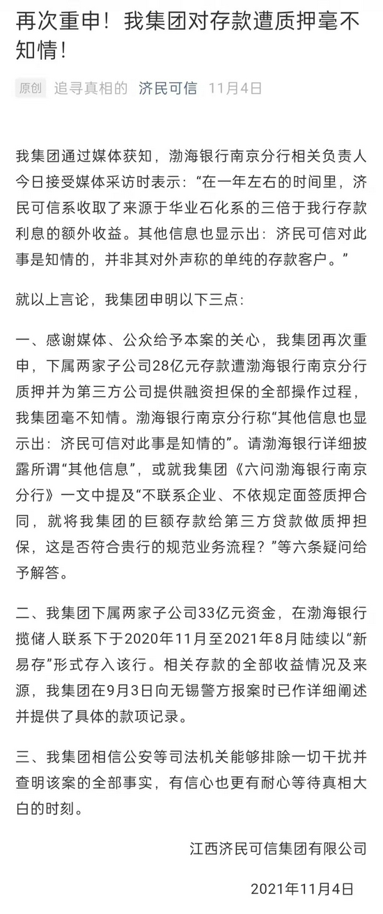 11月4日,濟民可信官方微信發(fā)布聲明,再次重申“對存款遭質(zhì)押毫不知情!”并要求渤海銀行提供相關(guān)說辭的進一步證據(jù)