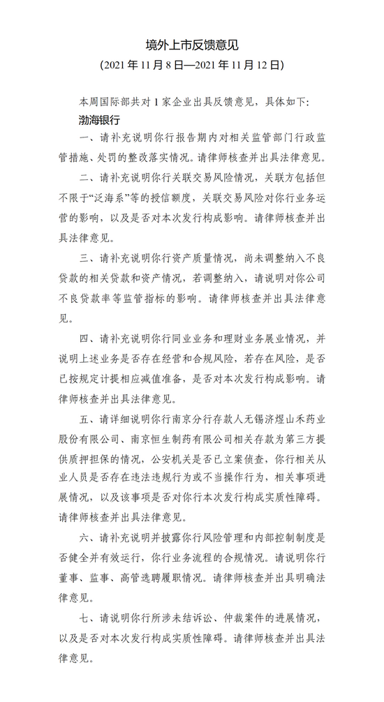 11月12日,證監(jiān)會官網(wǎng)發(fā)布對渤海銀行出具的境外上市反饋意見全文