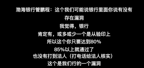 8月21日,渤海銀行南京分行營業(yè)部經(jīng)理胡兆鋒及其助理管鵬程,帶著華業(yè)石化兩位人員同濟民可信見面協(xié)商。濟民可信公開的協(xié)商錄音中,被標為南京分行營業(yè)部總經(jīng)理助理管鵬程的聲音承認,該項業(yè)務辦理過程中沒有與存款企業(yè)正面交流。這一說法還得到了錄音中標為華業(yè)石化方的承認。而且錄音中管鵬程承認該南京分行的驗印系統(tǒng)比對率達到85%以上就可以通過,是銀行的漏洞。
