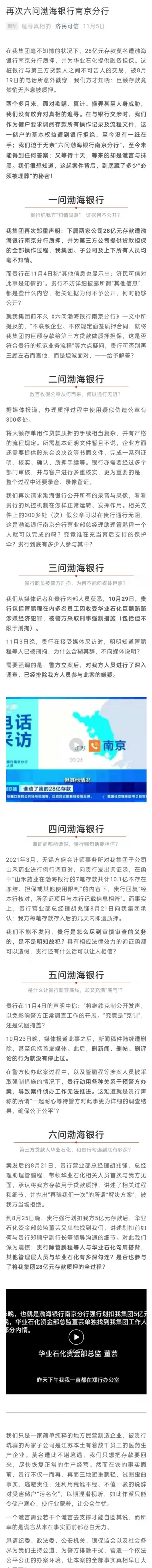 11月5日,針對“28億元存款莫名遭質(zhì)押”一事,濟民可信通過其微信公眾號發(fā)文再次六問渤海銀行南京分行